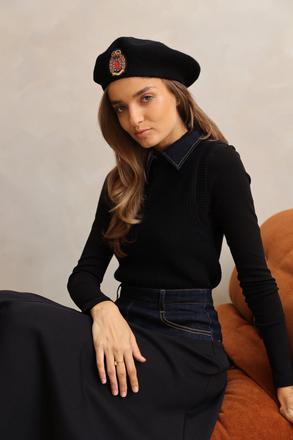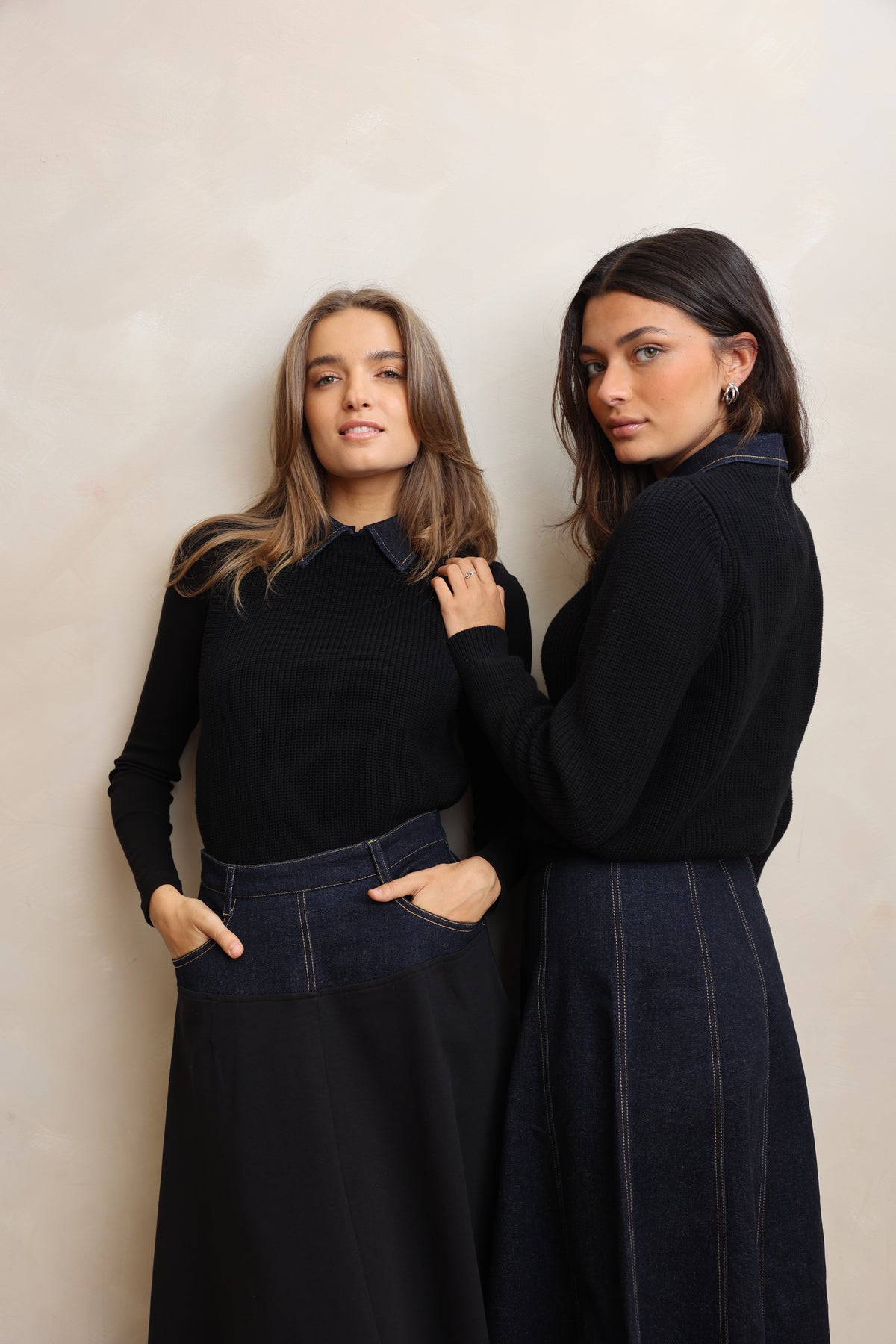 Elevate your layering game with this sleeveless Denim Collar Vest, which combines cozy knit fabric with a crisp denim collar for a fresh take on classic style. The vest fits comfortably at the waist, making it easy to pair over our classic long-sleeve T-necks. Whether dressed up or down, it adds a polished yet casual vibe to any outfit, making it a versatile staple for your collection.