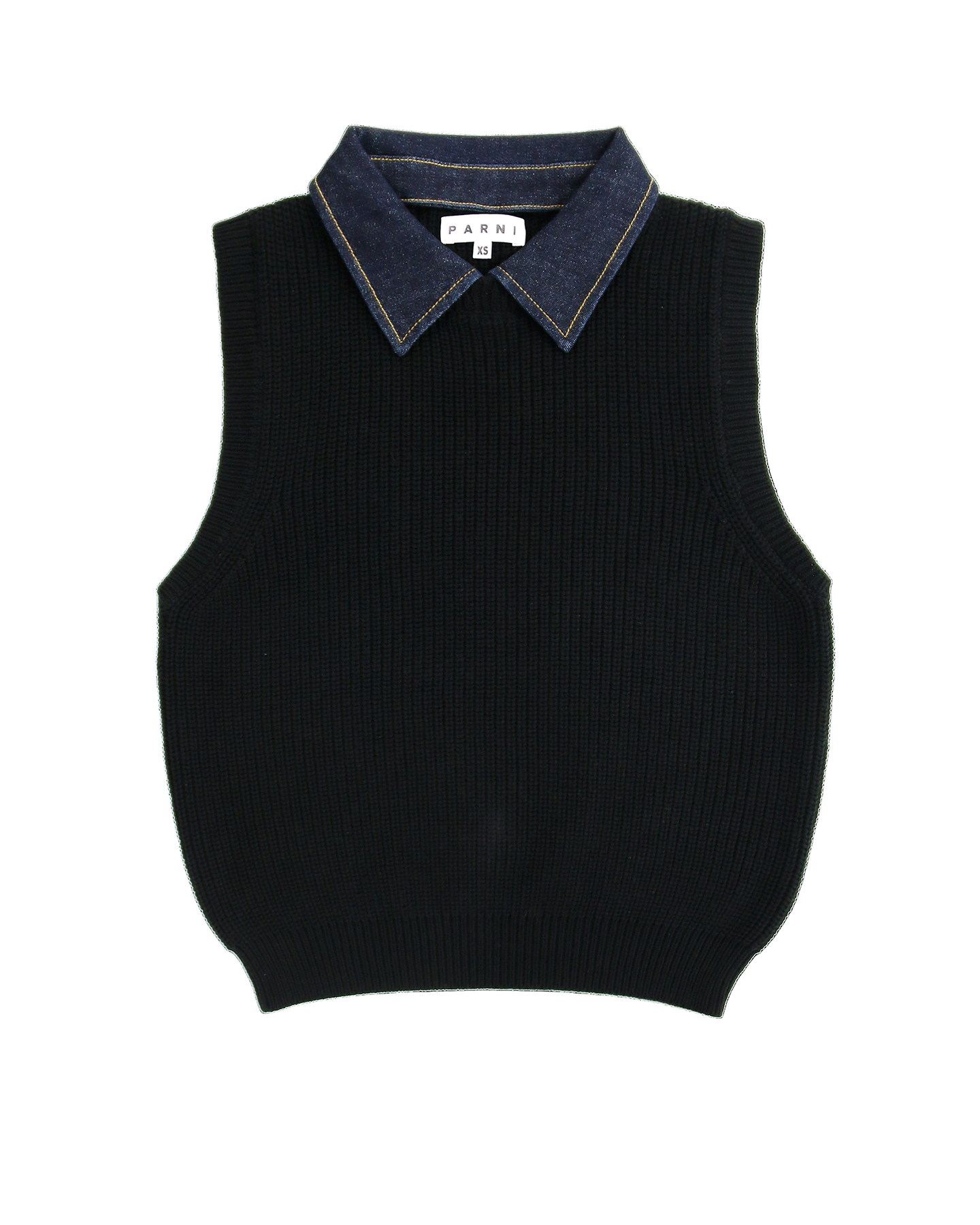 Black sleeveless sweater with denim collar on a white background