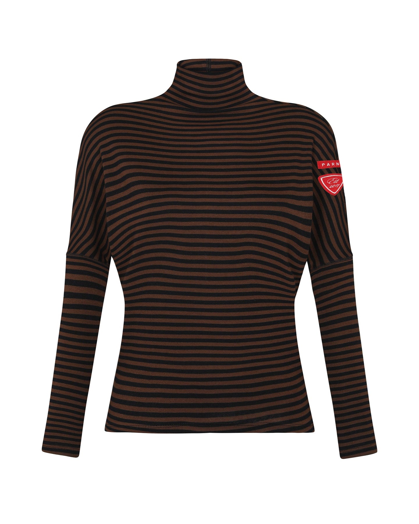 Black and brown striped turtleneck shirt with a red patch on a white background