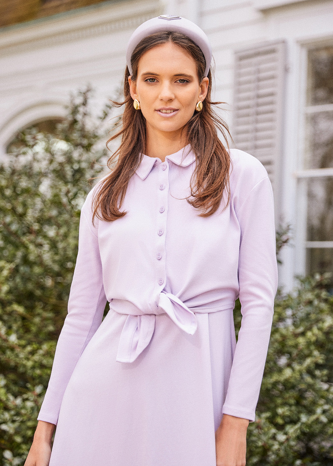 Young woman wearing the Tie Front Button Down Shirt in lavender over matching dress and matching headband